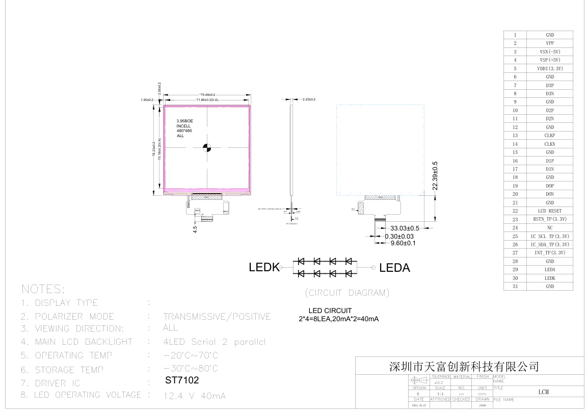 Mały moduł wbudowanego ekranu dotykowego IPS o przekątnej 3,95 cala dla inteligentnego domu obsługuje dwa interfejsy systemowe MIPI/IIC i układ scalony sterownika ST7102I (szybki czas reakcji 30 ms). Podświetlenie LED 4S2P (niski prąd 40 mA) równoważy jasność i wydajność energetyczną. Moduł o grubości 2,2 mm ułatwia kompaktową instalację.